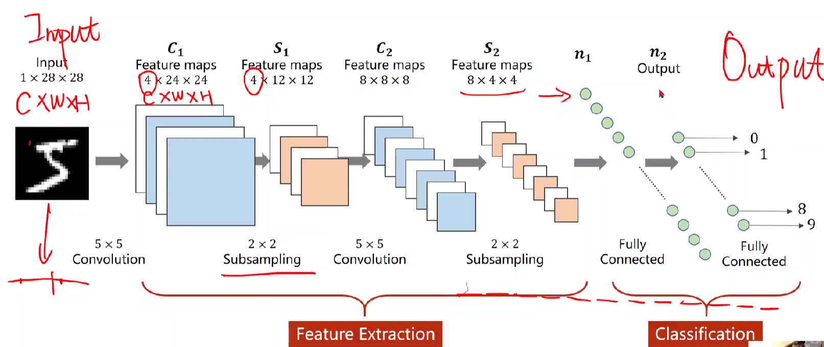 kernel是 5 * 5 (下面红色编号为特征提取Feature Exatraction, 3,4为Classification)