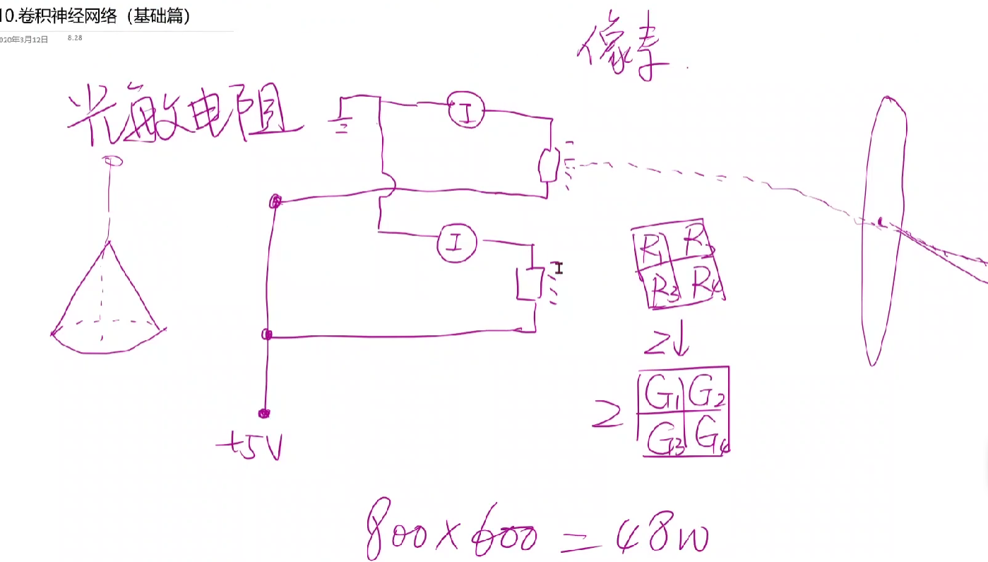 * 单色图像采集:通过光敏电阻获取像素,通过每个电阻来获得该光锥的光强。