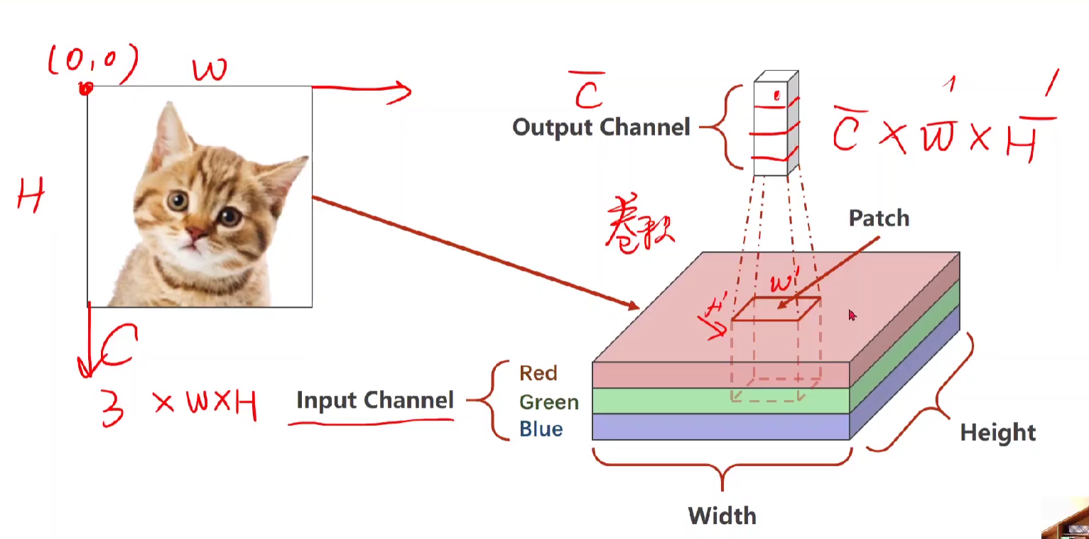 先在input里面取一个块patch [ h‘,w' ],然后开始在图像块中移动,对patch进行卷积操作,得到C、,W、H 都变的块,即上图的output。