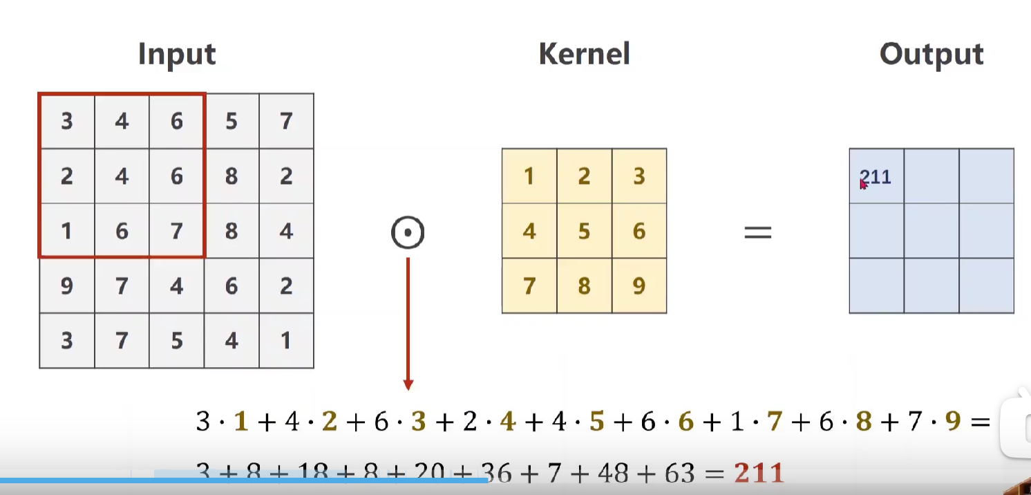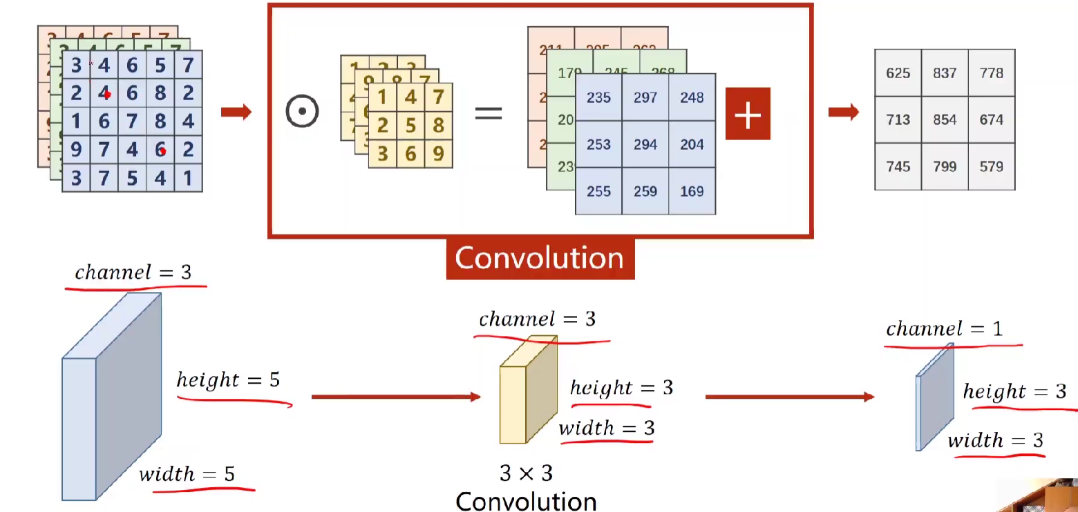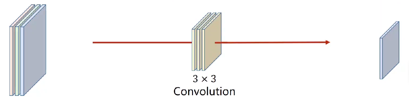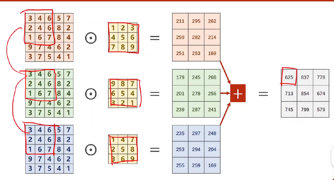 - 对每一个通道做卷积,数乘后求和,该过程其实就是卷积运算。