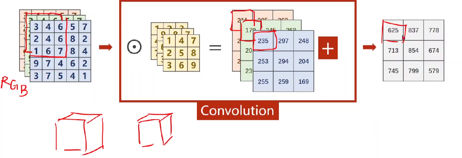 - 将上述的几个摞起来成为块,那么就分别是3*3*3的patch和一个用卷积核摞起来的3*3*3的块进行数乘后求和,即下图
