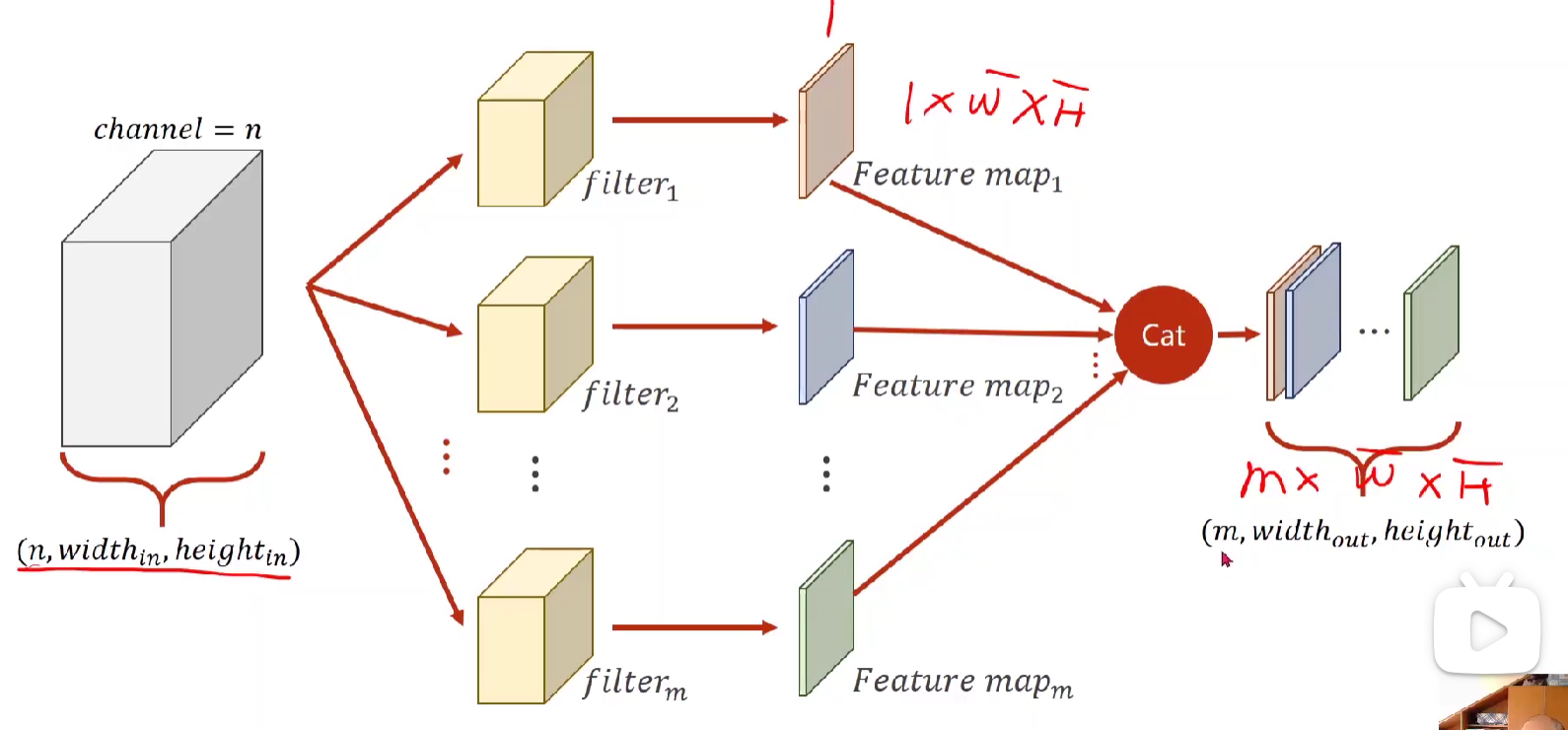 由上面易得,一个input为N*W*H,在通过一个卷积核N*W'H'后变成了1*W'*H'的map。