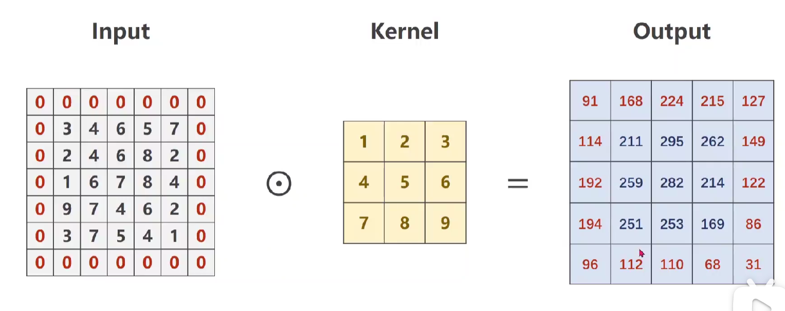 import torch input = [3,4,5,6,7, #输入的图像 2,4,6,8,2, 1,6,7,8,4, 9,7,4,6,2, 3,7,5,4,1] input = torch.Tensor(input).view(1,1,5,5) #reshape一下,batch,in_channel,w,h #初始化这个卷积,规定out_channel,in_channel,kernel_size,是否填充 #这里padding = 1,即行列各加一 #注意bias conv_layer = torch.nn.Conv2d(1,1,kernel_size=3,padding=1,bias=False) kernel = torch.Tensor([1,2,3,4,5,6,7,8,9]).view(1,1,3,3)#O, I, W, H,卷积的权重定义 conv_layer.weight.data = kernel.data output = conv_layer(input) print(output)>>