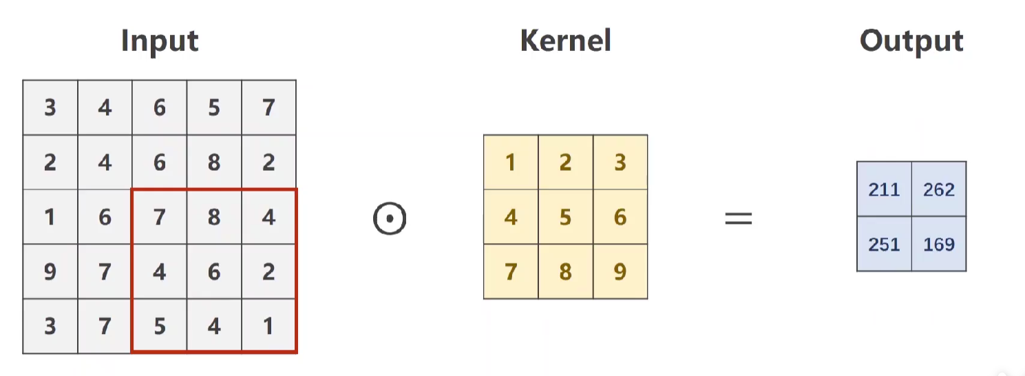 import torch input = [3,4,5,6,7, #输入的图像 2,4,6,8,2, 1,6,7,8,4, 9,7,4,6,2, 3,7,5,4,1] input = torch.Tensor(input).view(1,1,5,5) conv_layer = torch.nn.Conv2d(1,1,kernel_size=3,stride=2,bias=False) kernel = torch.Tensor([1,2,3,4,5,6,7,8,9]).view(1,1,3,3) conv_layer.weight.data = kernel.data output = conv_layer(input) print(output)>>