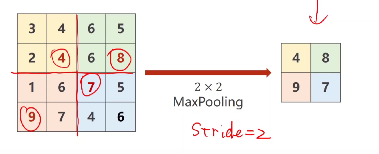 特点:是对一个通道做Max pooling, 而不是通道之间,所以通道数不变。下图用2*2做MxaPooling,图像缩为原来的一半。