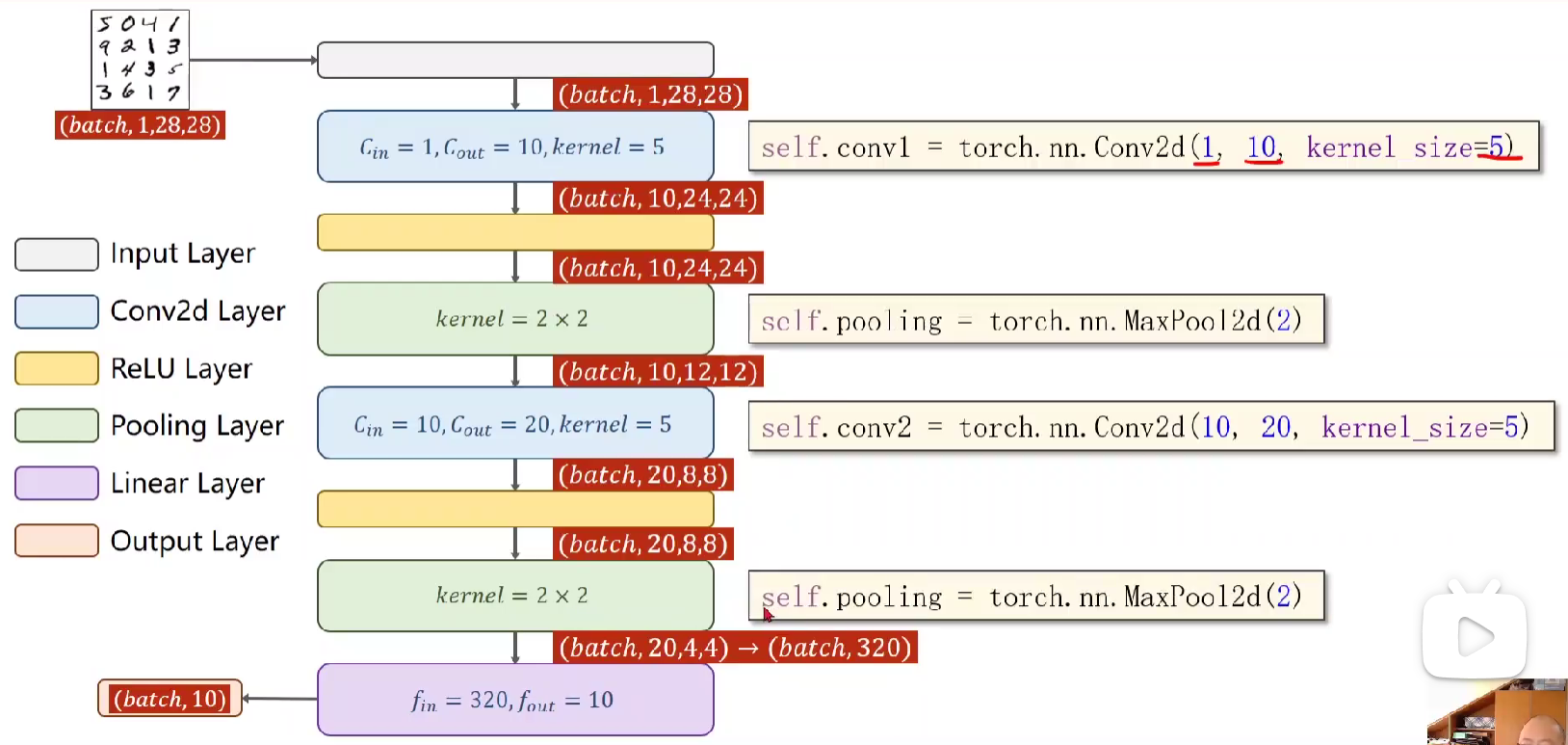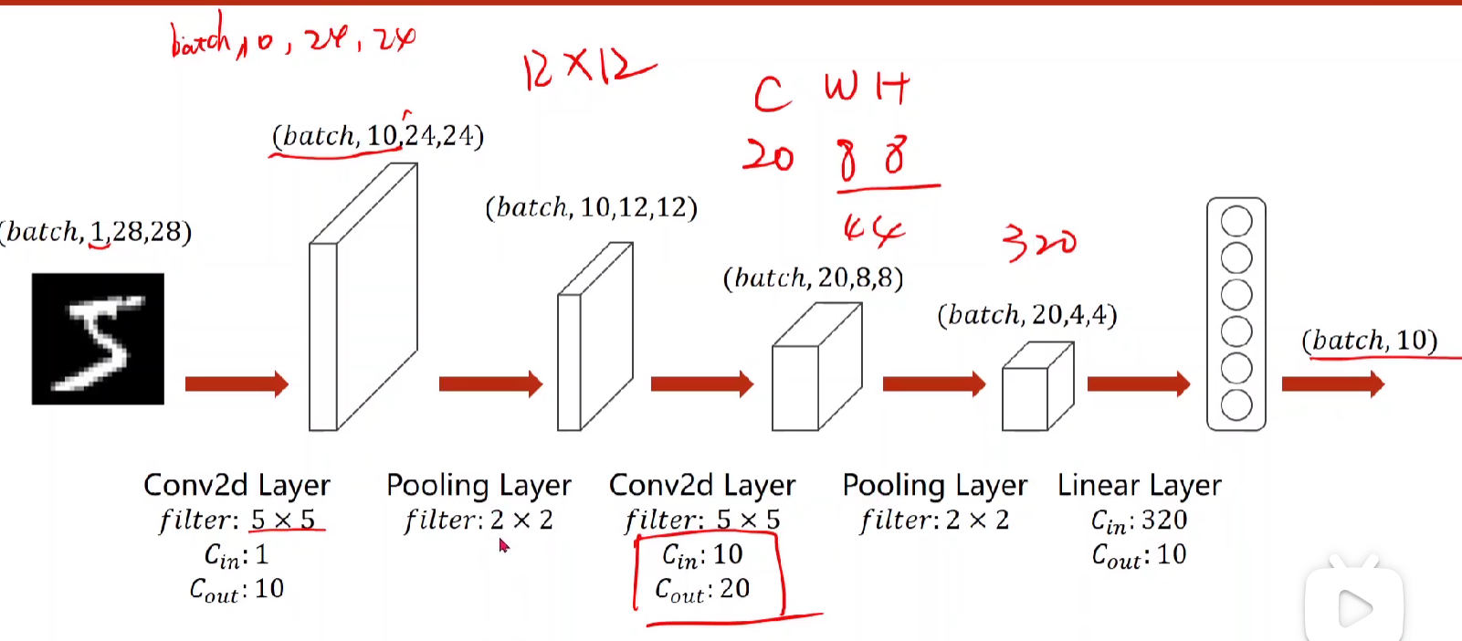 卷积——>最大池化——>到最后需要做一个view,将(batch20*4*4)->(batch,320)——>然后单纯做一个全连接层,将320直接降到十维