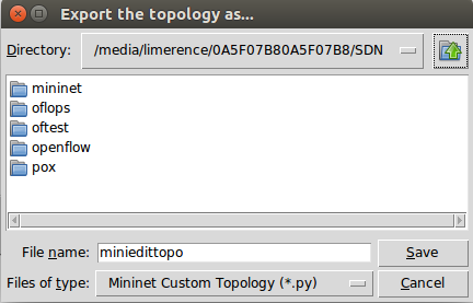 拓扑生成并确认无误之后,可以点击 miniedit 左上角的 File 菜单,选择 Export Level 2 Script,将拓扑保存为 Python 脚本