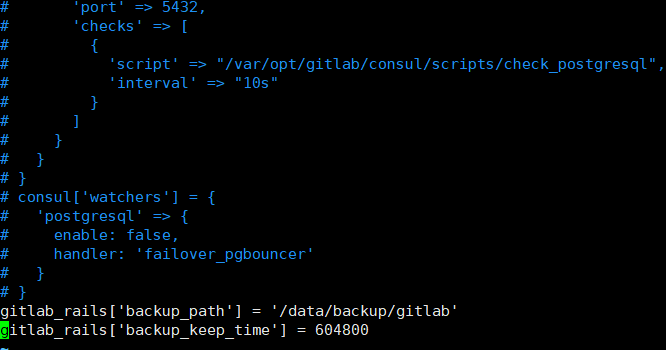 gitlab_rails['backup_keep_time'] = 604800 #备份保留的时间(以秒为单位, 这个是七天默认值)