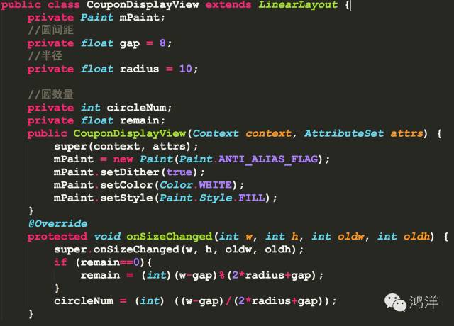 上面的图片其实和普通的Linearlayout,RelativeLayout一样,只是上下两边多了类似于半圆锯齿的形状。那么只需要处理不同地方。可以在上下两条线上画一个个白色的小圆来实现这种效果。