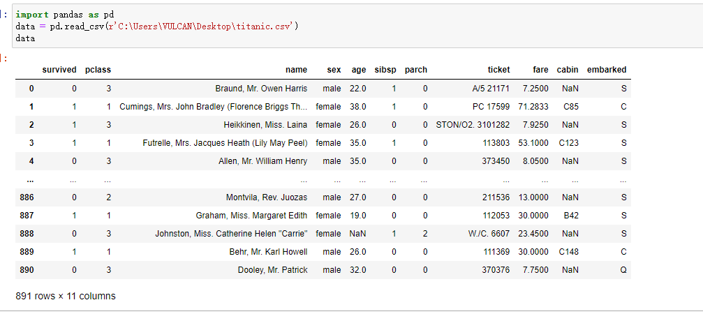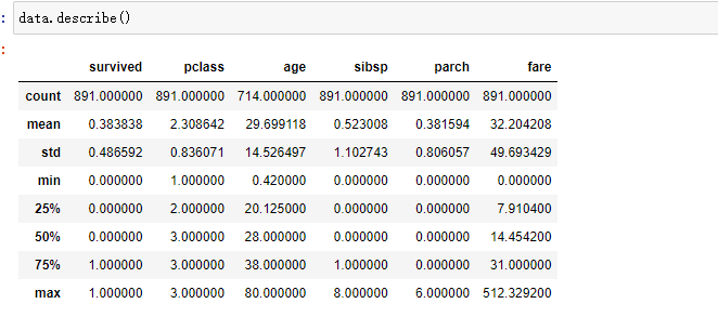 从数据输出结果可知,一共统计了891名乘客信息。其中,有177名乘客的年龄信息有缺失值,无缺失的乘客的平均年龄约为30岁;一等舱乘客数量不足25%,三等舱乘客数量超过50%。