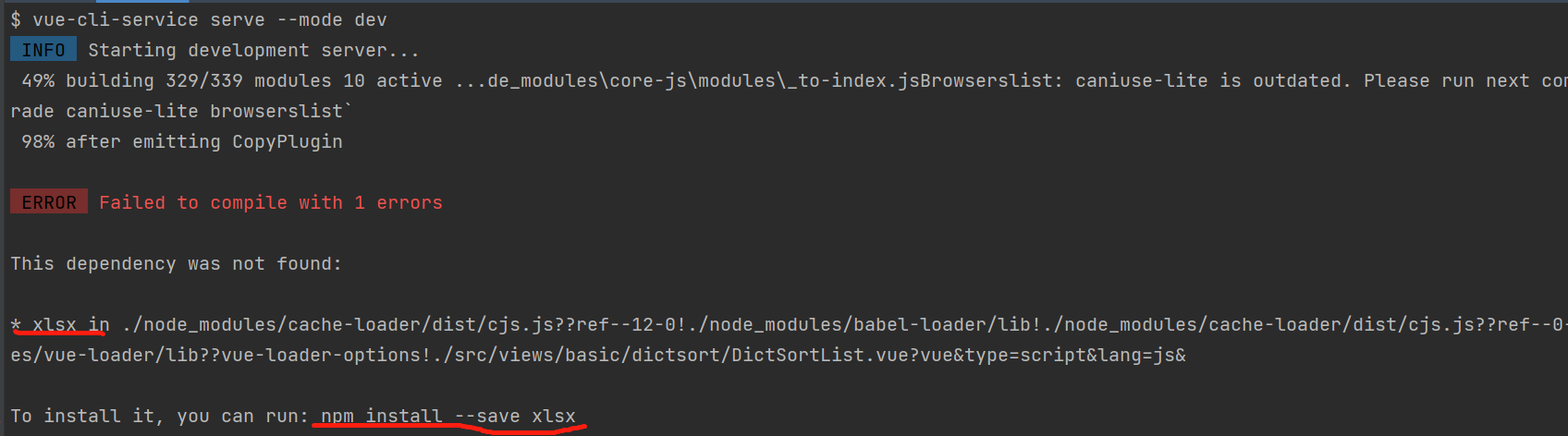 3.出现下面的错误则是缺少了xlsx的依赖,执行npm install --save xlsx