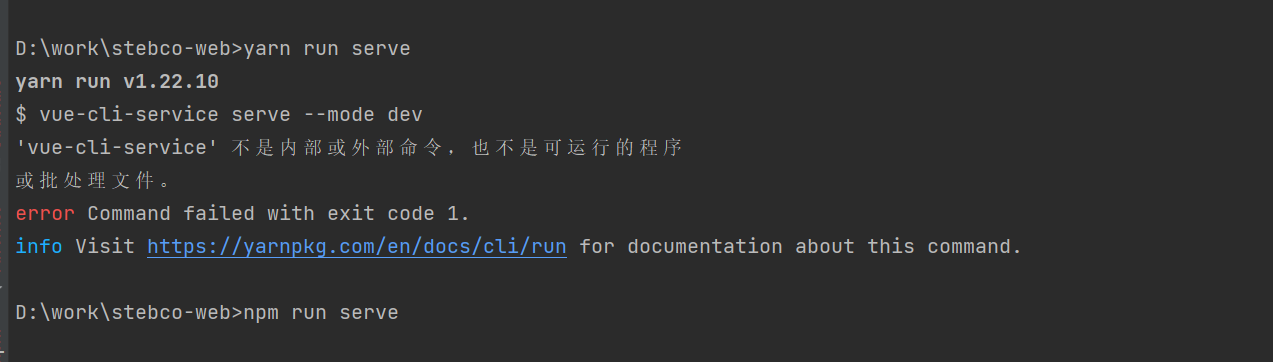 5.如果报vue-cli-service不是内部或外部命令,也不是可运行的程序则运行yarn install