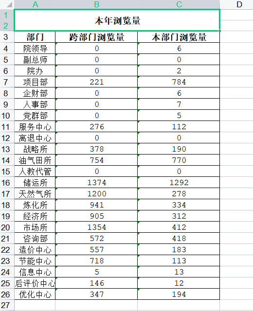 @RequestMapping(value = "/kms/knowledgeView/export") public void export( HttpServletRequest request,HttpServletResponse response) throws Exception { KnowledgeViewModel r = WebUtils.requestToBean(request, KnowledgeViewModel.class); //获取表头 String[] rowsName={"部门","跨部门浏览量","本部门浏览量"}; List<KnowledgeViewModel> orgList=knowledgeViewService.getOrgList(); String title = "本年浏览量"; List<Object[]> dataList = new ArrayList<Object[]>(); Object[] objs = null; for (int i = 0; i < orgList.size(); i++) { KnowledgeViewModel orgs = orgList.get(i); objs = new Object[rowsName.length]; objs[0] = orgs.getOrgName()!=null&& StringUtils.isNotEmpty(orgs.getOrgName()) ? orgs.getOrgName() : "-"; objs[1] = orgs.getNum(); objs[2] = orgs.getSumNum(); dataList.add(objs); } ExportExcel ex = new ExportExcel(response,title, rowsName, dataList); ex.export(); }