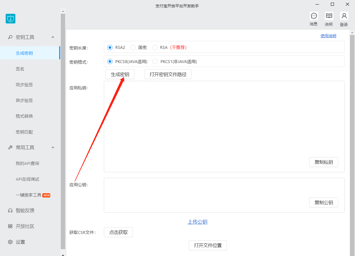 4.通过支付宝开发平台开发助手,生成密钥