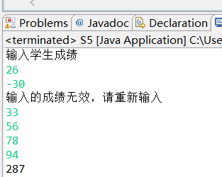 package Second; import java.util.Scanner; public class S5 { /** * @param args */ public static void main(String[] args) { // TODO Auto-generated method stub Scanner input = new Scanner(System.in); System.out.println("输入学生成绩"); int sum = 0; for (int i = 1; i <= 5; i++) { int grade = input.nextInt(); while (grade < 0 || grade > 100) { System.out.println("输入的成绩无效,请重新输入"); grade = input.nextInt(); break; } sum += grade; } System.out.println(sum); } }