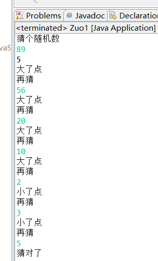 package Second; import java.util.Random; import java.util.Scanner; public class Zuo1 { /** * @param args */ public static void main(String[] args) { // TODO Auto-generated method stub Scanner input = new Scanner(System.in); System.out.println("猜个随机数"); int s = input.nextInt(); Random r = new Random(); int a = r.nextInt(99) + 1; System.out.println(+a); while (a != s) { if (s > a) { System.out.println("大了点"); } if (s < a) { System.out.println("小了点"); } System.out.println("再猜"); s = input.nextInt(); } System.out.println("猜对了"); } }