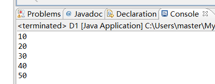 package Third; public class D1 { /** * @param args */ public static void main(String[] args) { // TODO Auto-generated method stub int[] a = { 10, 20, 30, 40, 50 }; for (int i = 0; i < a.length; i++) { System.out.println(a[i]); } } }
