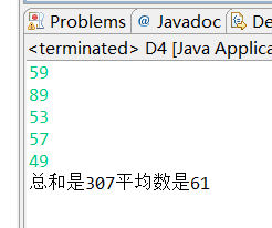 package Third; import java.util.Scanner; public class D4 { /** * @param args */ public static void main(String[] args) { // TODO Auto-generated method stub int[] a = new int[5]; int sum = 0; int ave = 0; Scanner input = new Scanner(System.in); for (int i = 0; i < a.length; i++) { a[i] = input.nextInt(); sum = sum + a[i]; ave = sum / a.length; } System.out.println("总和是" + sum + "平均数是" + ave); } }