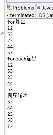 package Third; public class D5 { /** * @param args */ public static void main(String[] args) { // TODO Auto-generated method stub int[] a = { 12, 53, 23, 44, 53 }; System.out.println("for输出"); for (int i = 0; i < a.length; i++) { System.out.println(a[i]); } System.out.println("foreach输出"); for (int i : a) { System.out.println(i); } System.out.println("倒序输出"); for (int i = a.length - 1; i >= 0; i--) { System.out.println(a[i]); } } }