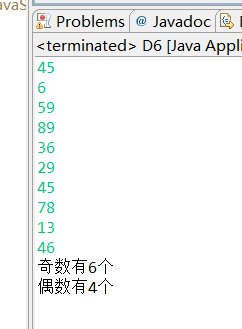 package Third; import java.util.Scanner; public class D6 { /** * @param args */ public static void main(String[] args) { // TODO Auto-generated method stub Scanner input = new Scanner(System.in); int[] a = new int[10]; int jishu = 0; int oushu = 0; for (int i = 0; i < a.length; i++) { a[i] = input.nextInt(); if (a[i] % 2 == 0) { oushu++; } else { jishu++; } } System.out.println("奇数有" + jishu + "个"); System.out.println("偶数有" + oushu + "个"); } }