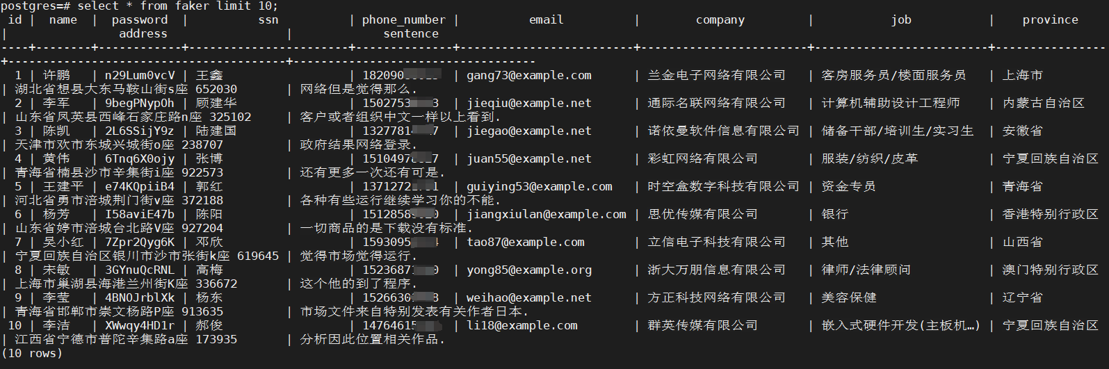 Faker 是一个 Python 库,用于生成各种类型的虚假数据,非常适合测试、开发和演示。本教程将展示如何使用 Faker 生成中文测试数据,并将其插入到 PostgreSQL 数据库中。