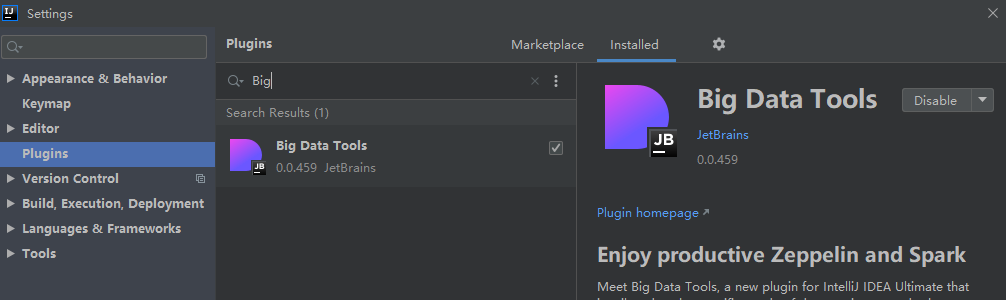 打开 File -> Settings -> Plugins,安装 Big Data Tools、Scala、Python、BashSupport。