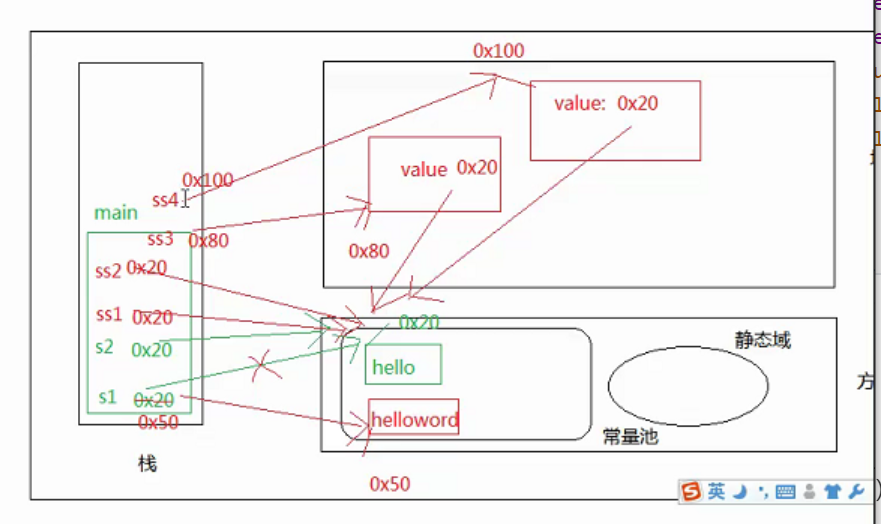 String s1="hello"; String s2="world"; String s="helloworld"; String s3="hello"+"world"; //有了变量存储位置就会放在堆中 String s4=s1+"world"; String s5="hello"+s2; s==s3;//true s==s4;//false s==s5;//false //堆中的存储位置不同 s4==s5;//false