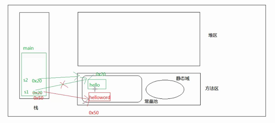 //不可变性 String s1="hello";//使用字面量(常量)对String赋值 String s2="hello"; System.out.prinln(s1==s2);//true 比较对象地址是否相等 s1="helloworld"; System.out.println(s1==s2);//false
