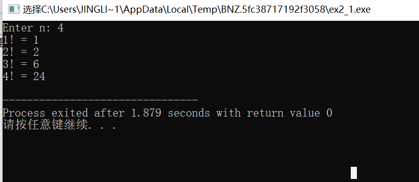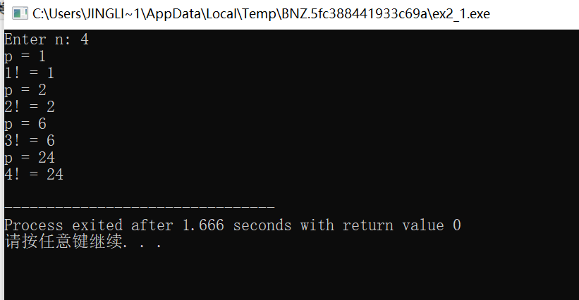 #include <stdio.h> long long fac(int n); int main() { int i,n; printf("Enter n: "); scanf("%d", &n); for(i=1; i<=n; ++i) printf("%d! = %lld\n", i, fac(i)); return 0;} long long fac(int n) { static long long p = 1; p = p*n; printf("p = %lld\n", p); return p; }