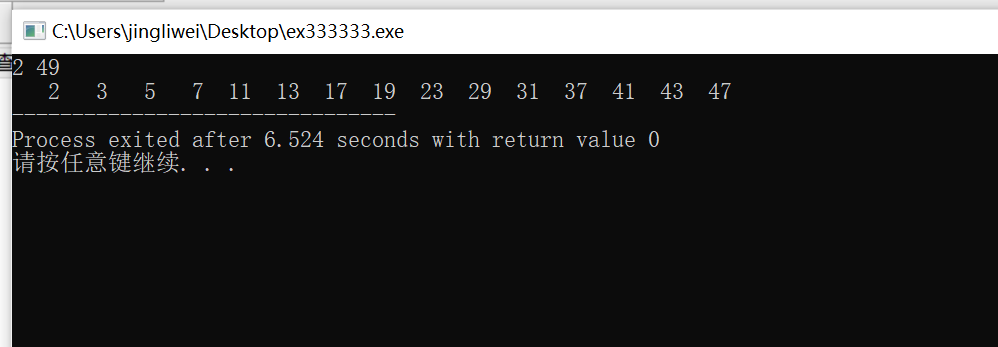 #include <stdio.h> #define N 1000 int fun(int n,int m,int bb[N]) { int i,j,k=0,flag; for(j=n;j<=m;j++) { flag=1 ; for(i=2;i<j;i++) if(j%i==0) { flag=0; break; } if(flag==1) bb[k++]=j; } return k; } int main(){ int n=0,m=0,i,k,bb[N]; scanf("%d",&n); scanf("%d",&m); for(i=0;i<m-n;i++) bb[i]=0; k=fun(n,m,bb); for(i=0;i<k;i++) printf("%4d",bb[i]); return 0; }