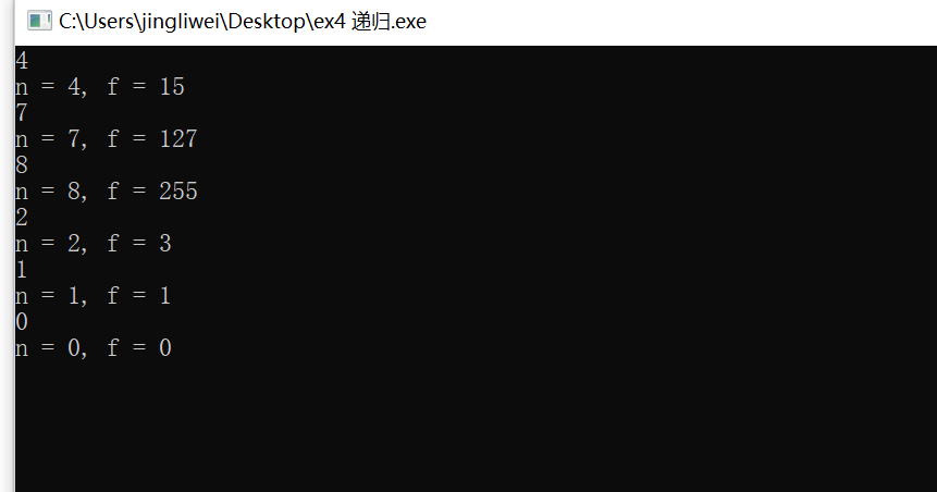 #include <stdio.h> long long fun(int n); int main() { int n; long long f; while(scanf("%d", &n) != EOF) { f = fun(n); printf("n = %d, f = %lld\n", n, f); } return 0; } long long fun (int n){ int i,sum=1 ; for (i=1;i<=n;i++){ if (n==0) { return 0;break;} else sum = 2*sum ; } return sum-1; }
