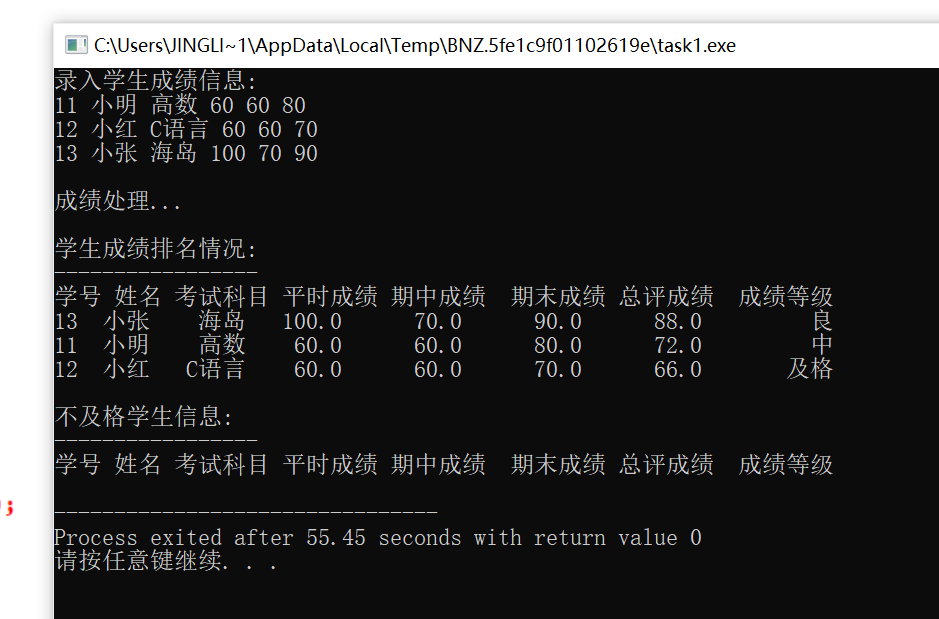 // P280例8.15 // 对教材上的程序作了微调整,把输出学生信息单独编写成一个函数模块 // 打印不及格学生信息和所有学生信息程分别调用 #include<stdio.h> #include<stdlib.h> #include<string.h> #define N 10 // 运行程序输入测试时,可以把N改小一些输入测试 typedef struct student { int id; /*学生学号 */ char name[20]; /*学生姓名 */ char subject[20]; /*考试科目 */ float perf; /*平时成绩 */ float mid; /* 期中成绩 */ float final; /* 期末成绩 */ float total; /* 总评成绩 */ char level[10]; /* 成绩等级 */ } STU; void input(STU[],int ); /*输入学生信息 */ void calc(STU[],int); /*计算总评和等级 */ int fail(STU[],STU [],int); /*不及格学生统计 */ void sort(STU[],int); /*排序 */ void print(STU[], int); /*输出学生信息*/ int main() { STU st[N],fst[N]; // 数组st记录学生信息,fst记录不及格学生信息 int k; // 用于记录不及格学生个数 printf("录入学生成绩信息:\n"); input(st,N); printf("\n成绩处理...\n"); calc(st,N); k = fail(st,fst,N); sort(st, N); printf("\n学生成绩排名情况:\n"); print(st, N); printf("\n不及格学生信息:\n"); print(fst, k); return 0; } // 输入学生信息 void input(STU s[],int n) { int i; for(i=0;i<n;i++) scanf("%d %s %s %f %f %f",&s[i].id,s[i].name,s[i].subject,&s[i].perf,&s[i].mid,&s[i].final); } // 计算总评和等级 void calc(STU s[],int n) { int i; for(i=0;i<n;i++) { s[i].total=s[i].perf*0.2+s[i].mid*0.2+s[i].final*0.6; if(s[i].total>=90) strcpy(s[i].level,"优"); // 注意:等级是字符型数组,要使用strcpy完成赋值 else if(s[i].total>=80 && s[i].total<90) strcpy(s[i].level,"良"); else if(s[i].total>=70 && s[i].total<80) strcpy(s[i].level,"中"); else if(s[i].total>=60 && s[i].total<70) strcpy(s[i].level,"及格"); else strcpy(s[i].level,"不及格"); } } // 不及格学生统计 // 数组s存放的是所有学生信息,数组t存放不及格学生信息,n是数组s中元素个数 // 函数返回值:返回的是不及格人数 int fail(STU s[],STU t[],int n) { int i,k=0; for(i=0;i<n;i++) if(s[i].total<60) t[k++]=s[i]; return k; } // 根据总评成绩对学生记录信息排序 // 使用的是冒泡排序算法 void sort(STU s[],int n) { int i,j; STU temp; for(i=0;i<n-1;i++) for(j=0;j<n-1-i;j++) if(s[j].total<s[j+1].total) { temp = s[j]; s[j] = s[j+1]; s[j+1] = temp; } } // 输出学生信息 void print(STU s[], int n) { int i; printf("-----------------\n"); printf("学号 姓名 考试科目 平时成绩 期中成绩 期末成绩 总评成绩 成绩等级\n"); for(i=0;i<n;i++) printf("%2d %5s%8s %7.1f %9.1f %9.1f %9.1f %10s\n",s[i].id,s[i].name,s[i].subject,s[i].perf,s[i].mid,s[i].final,s[i].total,s[i].level); }