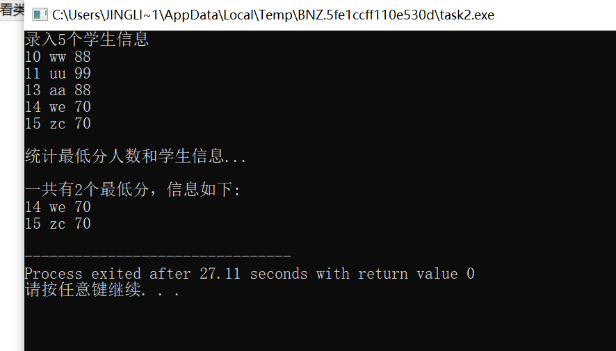#include <stdio.h> const int N=5; // 定义结构体类型struct student,并定义STU为其别名 typedef struct student { long no; char name[20]; int score; }STU; // 函数声明 void input(STU s[], int n); int findMinlist(STU s[], STU t[], int n); void output(STU s[], int n); int main() { STU stu[N], minlist[N]; int count; printf("录入%d个学生信息\n", N); input(stu, N); printf("\n统计最低分人数和学生信息...\n"); count = findMinlist(stu, minlist, N); printf("\n一共有%d个最低分,信息如下:\n", count); output(minlist, count); return 0; } // 输入n个学生信息,存放在结构体数组s中 void input(STU s[], int n) { int i; for(i=0; i<n; i++) scanf("%ld %s %d", &s[i].no, s[i].name, &s[i].score); } // 输出结构体s中n个元素信息 void output(STU s[], int n) { int i; for(i=0; i<n; i++) printf("%ld %s %d\n", s[i].no, s[i].name, s[i].score); } // 在结构体数组s中,查找最低分学生的记录,将其存入结构体数组t中 // 形参n是结构体数组s中元素个数 // 函数返回最低分的学生人数 int findMinlist(STU s[], STU t[], int n) { int i,j,x,m=0; STU temp; for(i=0;i<n-1;i++) for(j=0;j<n-1-i;j++) if(s[j].score<s[j+1].score) { temp = s[j]; s[j] = s[j+1]; s[j+1] = temp; } for(x=0;x<=4;x++) if(s[x].score==s[4].score) t[m++]=s[x]; return m; }