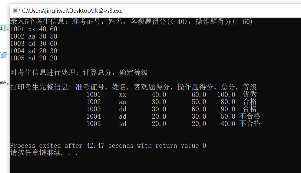 #include <stdio.h> #include <string.h> const int N = 5; // 定义结构体类型struct student,并定义其别名为STU typedef struct student { long int id; char name[20]; float objective; /*客观题得分*/ float subjective; /*操作题得分*/ float sum; char level[10]; }STU; // 函数声明 void input(STU s[], int n); void output(STU s[], int n); void process(STU s[], int n); int main() { STU stu[N]; printf("录入%d个考生信息: 准考证号,姓名,客观题得分(<=40),操作题得分(<=60)\n", N); input(stu, N); printf("\n对考生信息进行处理: 计算总分,确定等级\n"); process(stu, N); printf("\n打印考生完整信息: 准考证号,姓名,客观题得分,操作题得分,总分,等级\n"); output(stu, N); return 0; } // 录入考生信息:准考证号,姓名,客观题得分,操作题得分 void input(STU s[], int n) { int i; for (i=0;i<n;i++){ scanf("%ld %s %f %f",&s[i].id,&s[i].name,&s[i].objective,&s[i].subjective);} } //输出考生完整信息: 准考证号,姓名,客观题得分,操作题得分,总分,等级 void output(STU s[], int n) { int i; for (i=0;i<n;i++) printf("%25ld %6s %10.1f %10.1f %7.1f %5s\n",s[i].id,s[i].name,s[i].objective,s[i].subjective,s[i].sum,s[i].level); } // 对考生信息进行处理:计算总分,排序,确定等级 void process(STU s[], int n) { int i,j; STU temp; for (i=0;i<=N-1;i++){ s[i].sum=s[i].objective+s[i].subjective; if (i<=N/10) strcpy(s[i].level,"优秀"); if (i>N/10&&i<=N/2) strcpy(s[i].level,"合格"); if (i>n/2) strcpy(s[i].level,"不合格"); } for (i=0;i<=N-1;i++) for(j=0;j<=N;j++) if (s[j].sum<s[j+1].sum) temp=s[j]; s[j]=s[j+1]; s[j+1]=temp; }