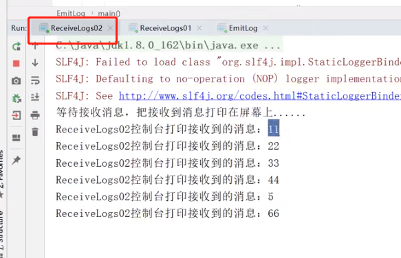 先把原来的普通队列删掉,在重启消费者1,然后启动生产者并发消息: