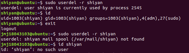 | e)删除账号test | |