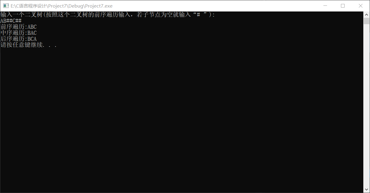 cout << "输入一个二叉树(按照这个二叉树的前序遍历输入,若子节点为空就输入“# ”):" << endl;