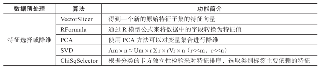 大数据是机器学习的基础,为机器学习提供充足的数据训练集。在数据量非常大的时候,需要通过数据规约技术删除或者减少冗余的维度属性以来达到精简数据集的目的,类似于抽样的思想,虽然缩小了数据容量,但是并没有改变数据的完整性。Spark ML提供的特征选择和降维的方法如下表所示: