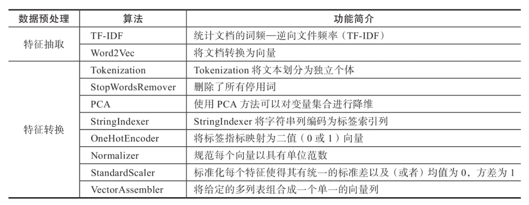 上面的转换算法中,词频逆文档频率(TF-IDF)、Word2Vec、PCA是比较常见的,如果你做过文本挖掘处理,那么对此应该并不陌生。