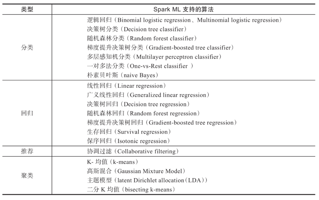 Spark支持分类、回归、聚类、推荐等常用的机器学习算法。见下表: