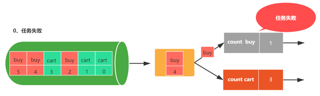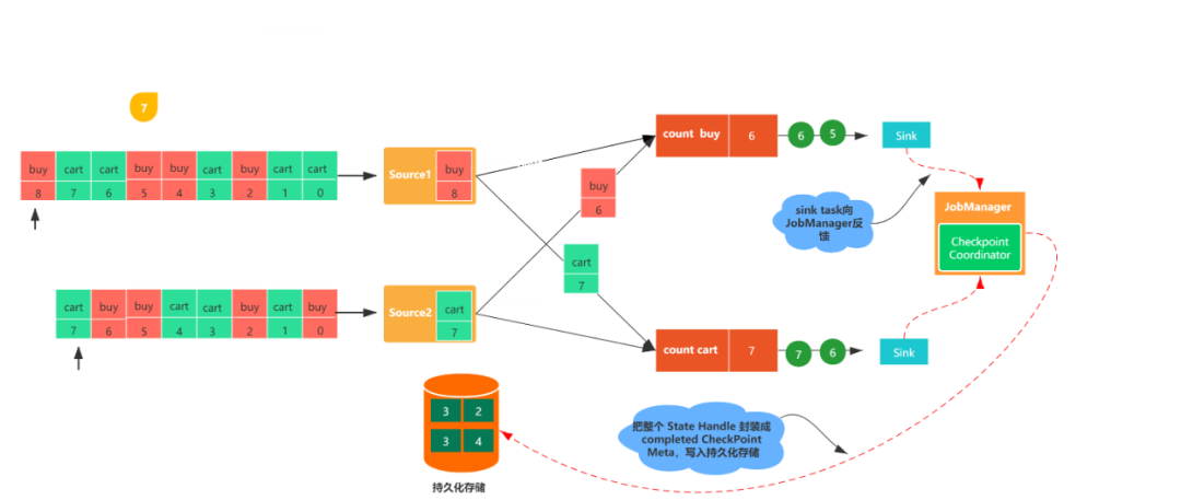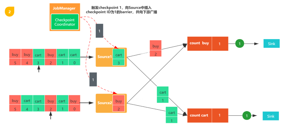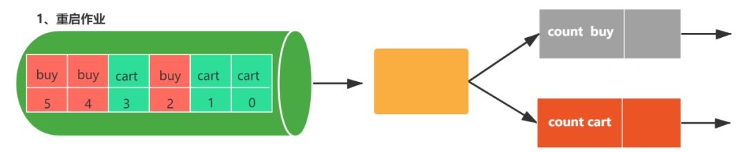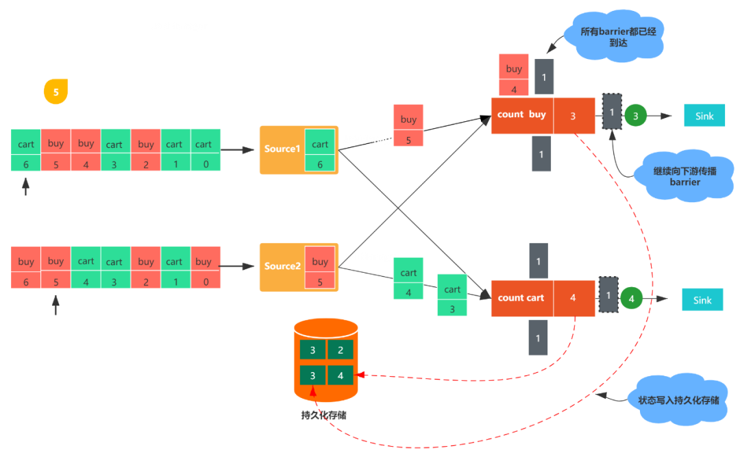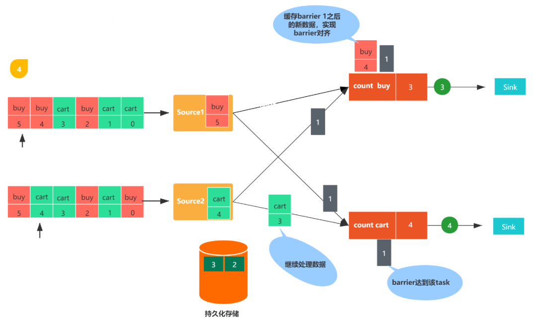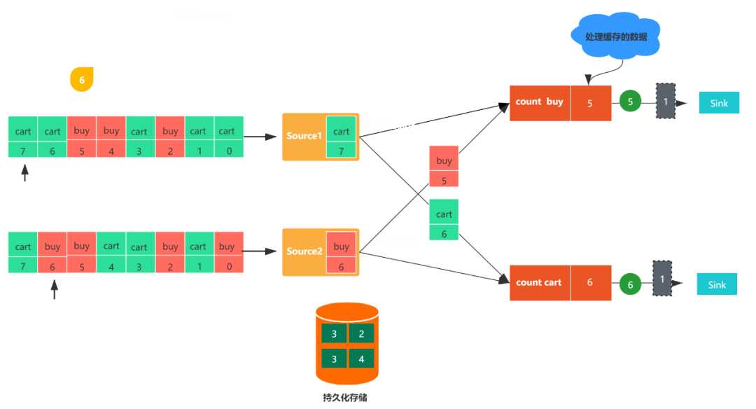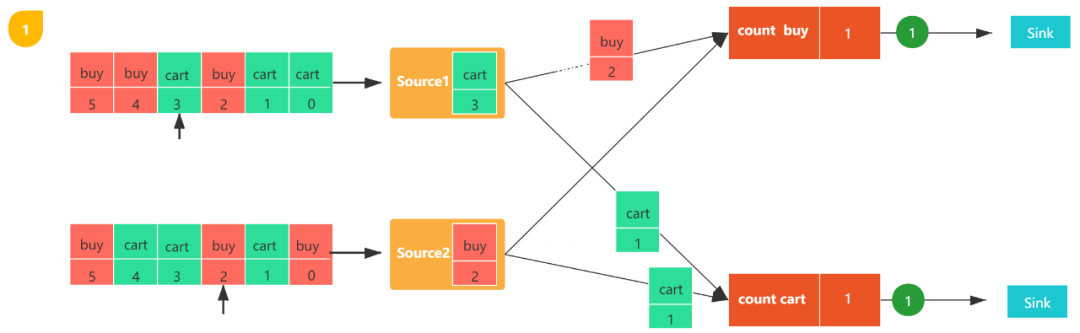 图1,包括两个流,每个任务都会消费一条用户行为数据(包括购买(buy)和加购(cart)),数字代表该数据的偏移量,count buy任务统计购买行为的个数,coun cart统计加购行为的个数。