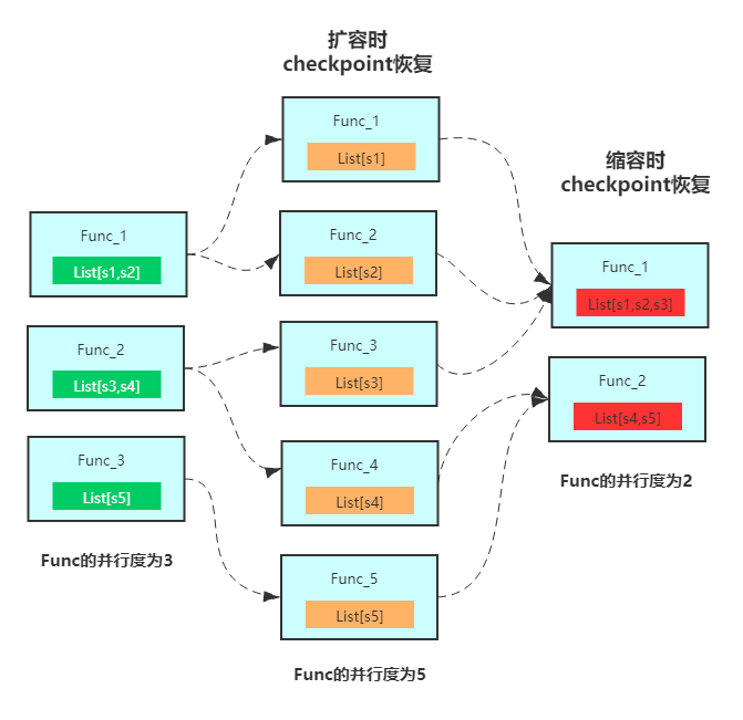 使用Operator ListState时,在进行扩缩容时,重分布的策略(状态恢复的模式)如下图所示:
