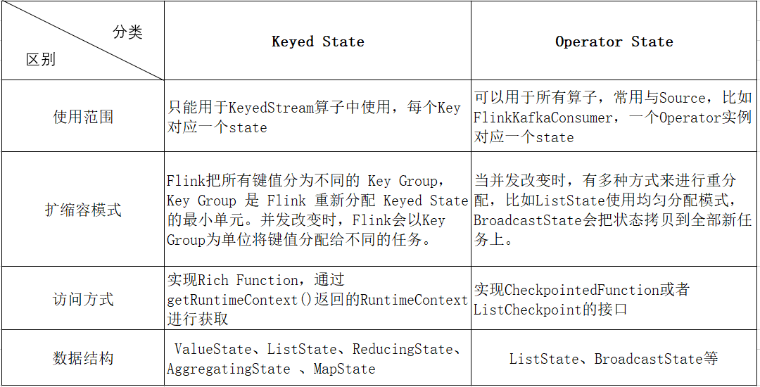 Flink提供了两种基本类型的状态:分别是 Keyed State和Operator State。根据不同的状态管理方式,每种状态又有两种存在形式,分别为:managed(托管状态)和raw(原生状态)。具体如下表格所示。需要注意的是,由于Flink推荐使用managed state,所以下文主要讨论managed state,对于raw state,本文不会做过多的讨论。