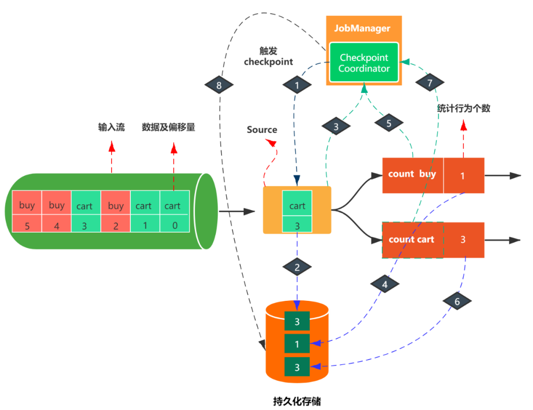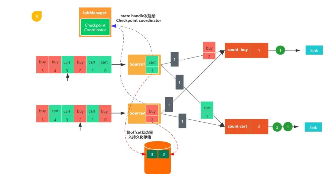 第二步:假设当消费到[cart,3]这条数据时,触发了checkpoint。那么此时数据源会把消费的偏移量3写入持久化存储。