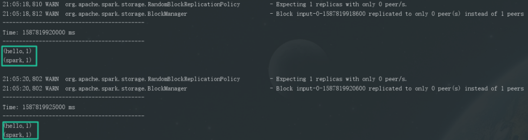object WordCount {def main(args:Array[String]){val conf = new SparkConf().setMaster("local[2]").setAppName("NetworkWordCount")val ssc = new StreamingContext(conf, Seconds(5))val lines = ssc.socketTextStream("localhost", 9999)val words = lines.flatMap(_.split(" "))val pairs = words.map(word => (word, 1))val wordCounts = pairs.reduceByKey(_ + _)wordCounts.print()ssc.start()ssc.awaitTermination()}}