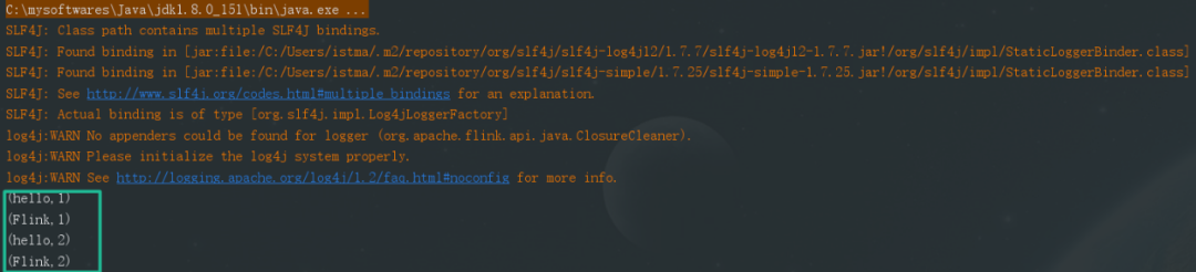 public class WordCount {public static void main(String[] args) throws Exception {StreamExecutionEnvironment env = StreamExecutionEnvironment.getExecutionEnvironment().setParallelism(1);DataStreamSource<String> streamSource = env.socketTextStream("localhost", 9999);SingleOutputStreamOperator<Tuple2<String,Integer>> words = streamSource.flatMap(new FlatMapFunction<String, Tuple2<String,Integer>>() {public void flatMap(String value, Collector<Tuple2<String,Integer>> out) throws Exception {String[] splits = value.split("\\s");for (String word : splits) {out.collect(Tuple2.of(word, 1));}}});words.keyBy(0).sum(1).print();env.execute("WC");}}