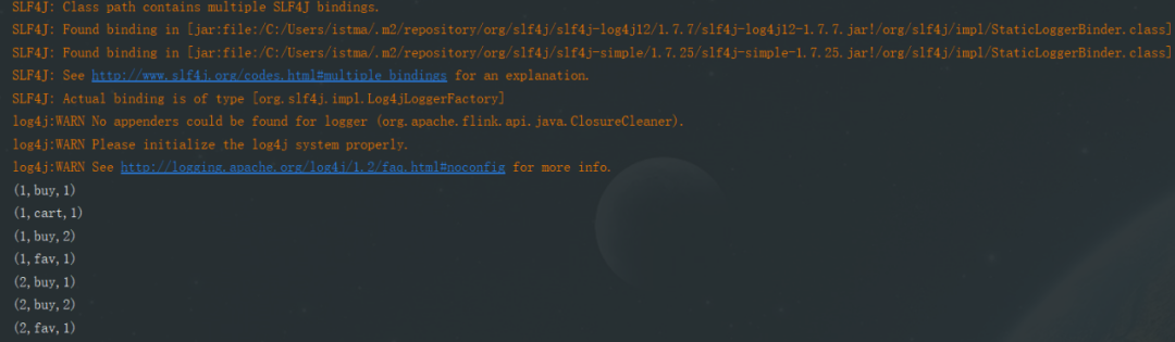 public class MapStateExample {//统计每个用户每种行为的个数public static class UserBehaviorCnt extends RichFlatMapFunction<Tuple3<Long, String, String>, Tuple3<Long, String, Integer>> {//定义一个MapState句柄private transient MapState<String, Integer> behaviorCntState;// 初始化状态public void open(Configuration parameters) throws Exception {super.open(parameters);MapStateDescriptor<String, Integer> userBehaviorMapStateDesc = new MapStateDescriptor<>("userBehavior", // 状态描述符的名称TypeInformation.of(new TypeHint<String>() {}), // MapState状态的key的数据类型TypeInformation.of(new TypeHint<Integer>() {}) // MapState状态的value的数据类型);behaviorCntState = getRuntimeContext().getMapState(userBehaviorMapStateDesc); // 获取状态}public void flatMap(Tuple3<Long, String, String> value, Collector<Tuple3<Long, String, Integer>> out) throws Exception {Integer behaviorCnt = 1;// 如果当前状态包括该行为,则+1if (behaviorCntState.contains(value.f1)) {behaviorCnt = behaviorCntState.get(value.f1) + 1;}// 更新状态behaviorCntState.put(value.f1, behaviorCnt);out.collect(Tuple3.of(value.f0, value.f1, behaviorCnt));}}public static void main(String[] args) throws Exception {StreamExecutionEnvironment env = StreamExecutionEnvironment.getExecutionEnvironment().setParallelism(1);// 模拟数据源[userId,behavior,product]DataStreamSource<Tuple3<Long, String, String>> userBehaviors = env.fromElements(Tuple3.of(1L, "buy", "iphone"),Tuple3.of(1L, "cart", "huawei"),Tuple3.of(1L, "buy", "logi"),Tuple3.of(1L, "fav", "oppo"),Tuple3.of(2L, "buy", "huawei"),Tuple3.of(2L, "buy", "onemore"),Tuple3.of(2L, "fav", "iphone"));userBehaviors.keyBy(0).flatMap(new UserBehaviorCnt()).print();env.execute("MapStateExample");}}