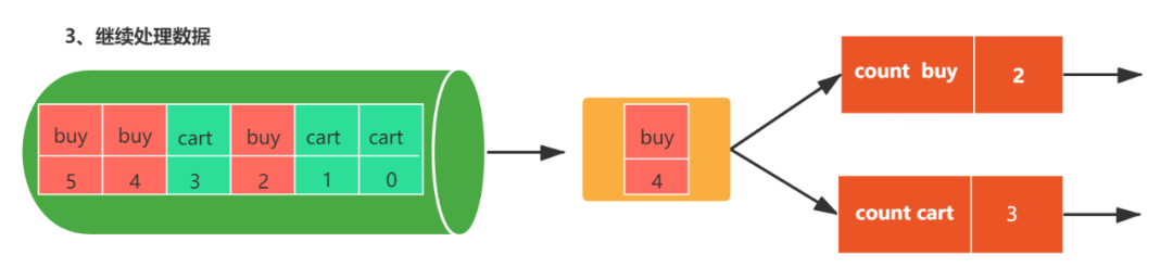 如上图,输入流是用户行为数据,包括购买(buy)和加入购物车(cart)两种,每种行为数据都有一个偏移量,统计每种行为的个数。