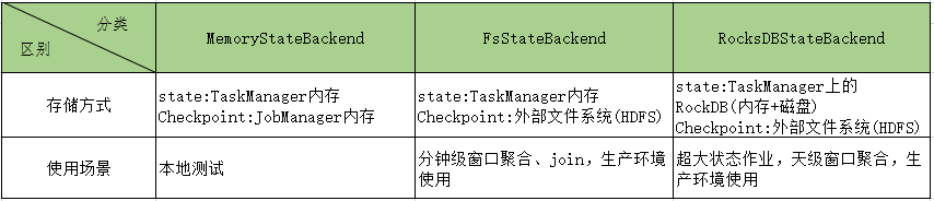 上面使用的状态都需要存储到状态后端(StateBackend),然后在checkpoint触发时,将状态持久化到外部存储系统。Flink提供了三种类型的状态后端,分别是基于内存的状态后端(MemoryStateBackend、基于文件系统的状态后端(FsStateBackend)以及基于RockDB作为存储介质的RocksDB StateBackend。这三种类型的StateBackend都能够有效地存储Flink流式计算过程中产生的状态数据,在默认情况下Flink使用的是MemoryStateBackend,区别见下表。下面分别对每种状态后端的特点进行说明。