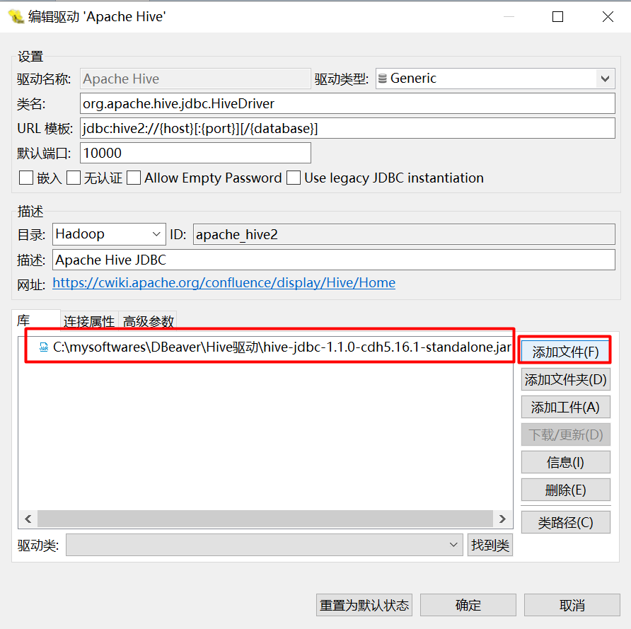 在点击编辑驱动设置之后,会弹出一个窗口,让你选择驱动的位置,点击添加文件,选择相应的hive驱动即可。然后点击确定。